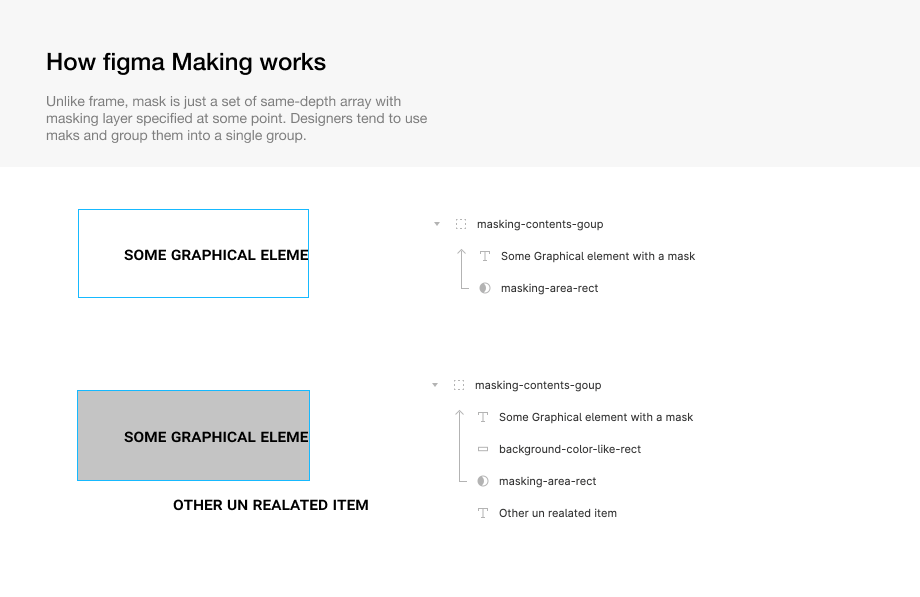 While frame and other code implementation (css container or flutter clip) has a straight forward hierarchical structure, masking in design tool does not have a hierarchical structure.